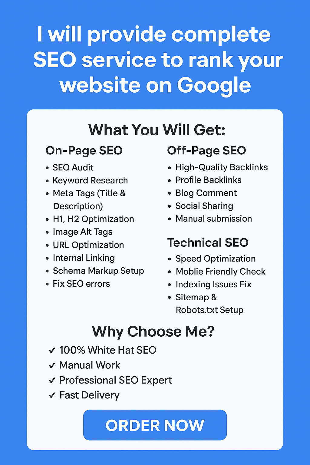 ??? Boost Your Website Ranking with Complete SEO Services!Do you want your website to rank higher on Google, get more traffic, and grow your business? You’re in the right place! I provide Full SEO Services including On-Page, Off-Page, Technical SEO, and WordPress Optimization to ensure your website performs at its best.My Services Include:On-Page SEO: Meta tags, headings, keyword optimization, internal linking, content optimization